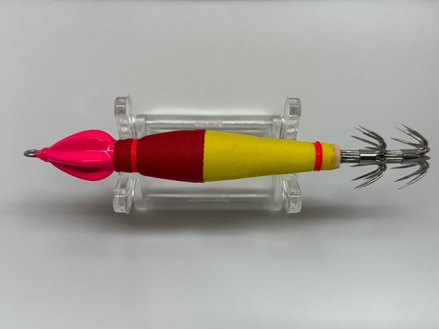 カラー名 レッド/イエロー ボディカラー ピンク(ノングロー) レッド部の生地 紫外線発色無し イエロー部の生地 紫外線発色無し 一番最後まで悩んだのがこのカラー、 特に黄色の生地で悩みました。 紫外線発色にするか? 紫外線無発色にするか? 悩んだ結果は無発色。 素材本来の明るいカラーだけでイカに挑んでもらいます。 このカラーの相反するカラーは、 限定発売の若狭のレモン こちらは超紫外線発色します。 浅棚で力を発揮するカラーです。 (浅棚5m~20m)